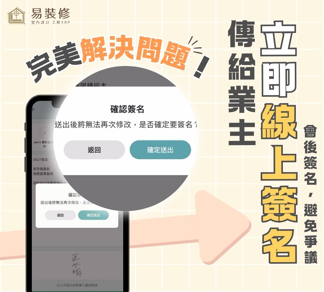 我們經常聽到設計師吐槽客戶事後反悔、失憶,於是我們推出全台獨家的雙向確認功能,讓業主可直接於易裝修業主版 APP簽名 ,留下佐證,有效減少爭議!