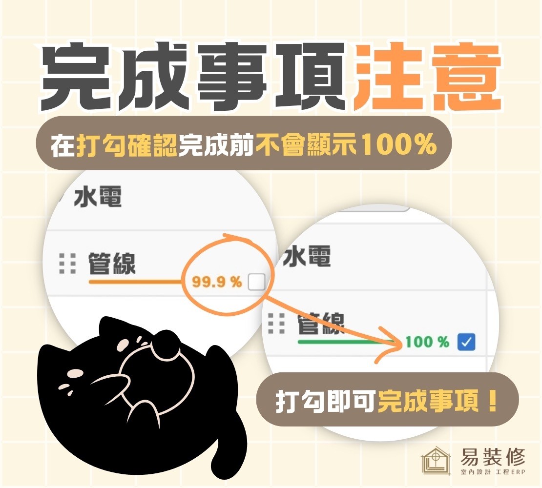 直到使用者手動打勾「項目完成」才會變為 100%