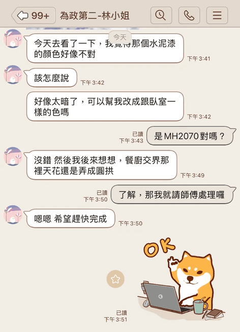 每一次客戶提出想法、要求調整時,立刻在雙方都能看見的地方,用文字記錄的形式留下追加減需求——當然,最好是有報價和工期的,並且直到客戶用文字回應確認,再執行施工。這不是為了找客戶麻煩,而是為了保護雙方,如果你覺得Line訊息會被收回、群組會被解散,到時候很難追溯又有得吵,又或是很不想開口閉口都是錢,那我推薦你用下一個方法。