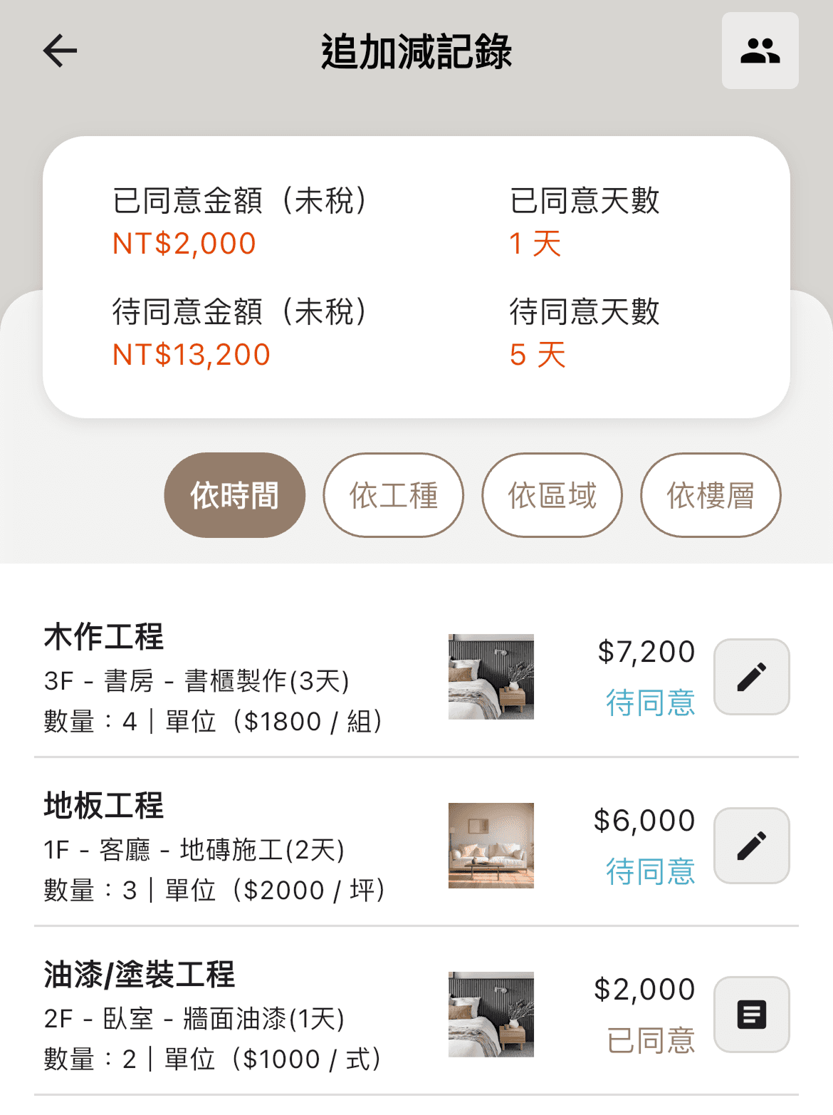 讓你可以在客戶提出需求的當下,立刻透過系統發送「追加減項目」給業主,這份確認表會幫你留下: